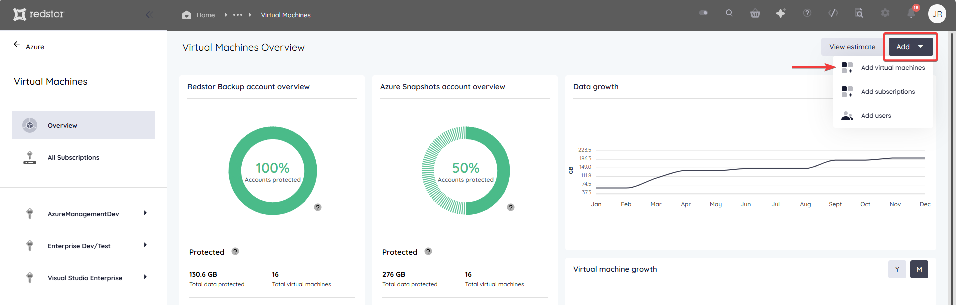 7. You will be shown a list of VMs that your Azure user has access to, and that are located in a subscription that is not yet protected by Redstor. Select one or more VMs from the list (all are selected by default) and click Add. This will queue the deployment of a new virtual backup appliance into the relevant subscription.