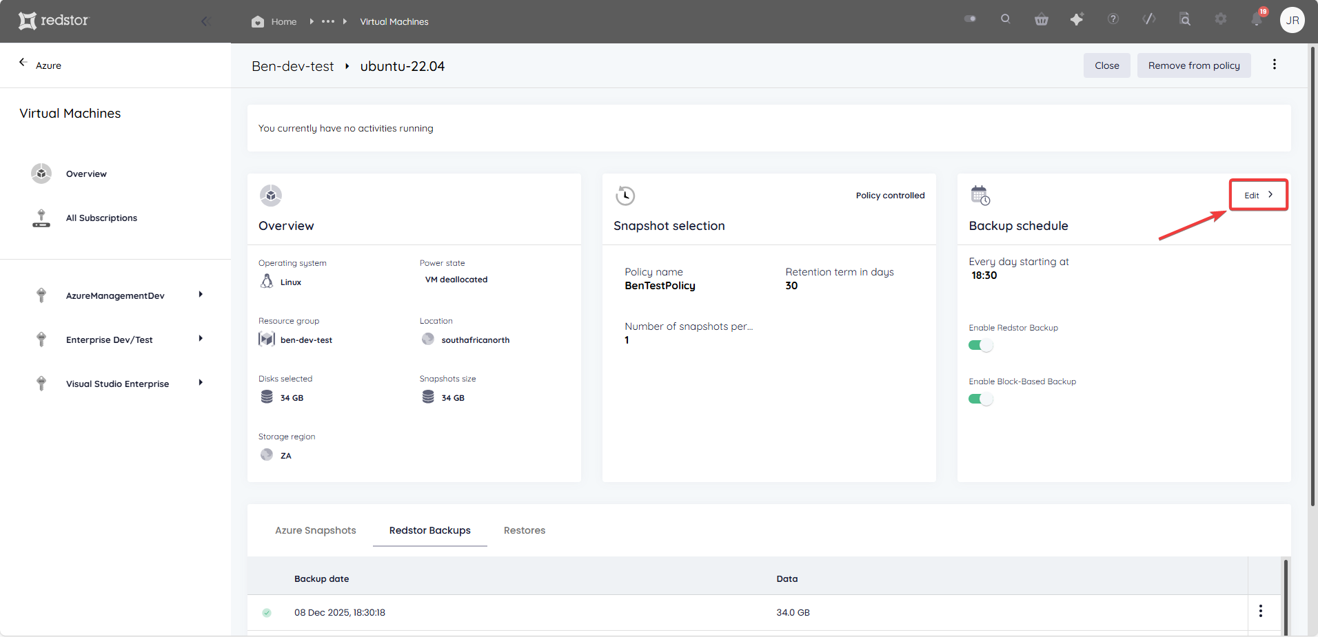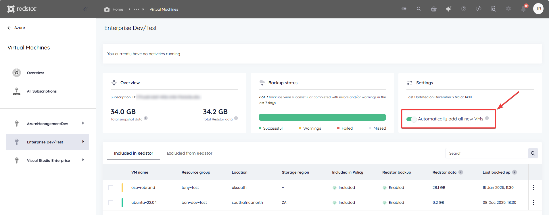 You can enable Redstor Backup (formerly known as Redstor Protect) using the toggle switch on the Backup schedule card of any VM. This means that for the selected VM, all backups stored in Azure will also be copied to the Redstor Storage Platform for off-site storage at an additional cost.