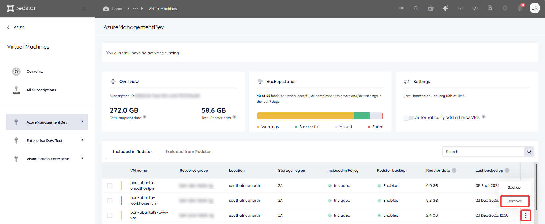 For multiple VMs, make your selection and click Remove at the bottom of the page.