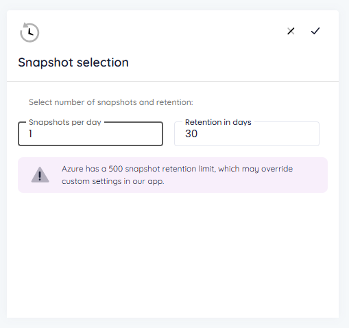 From the Snapshot selection card, you can also set the number of snapshots to be taken per day (up to 24) and the retention of these snapshots (up to 90 days). Click on the check mark to save your choice.