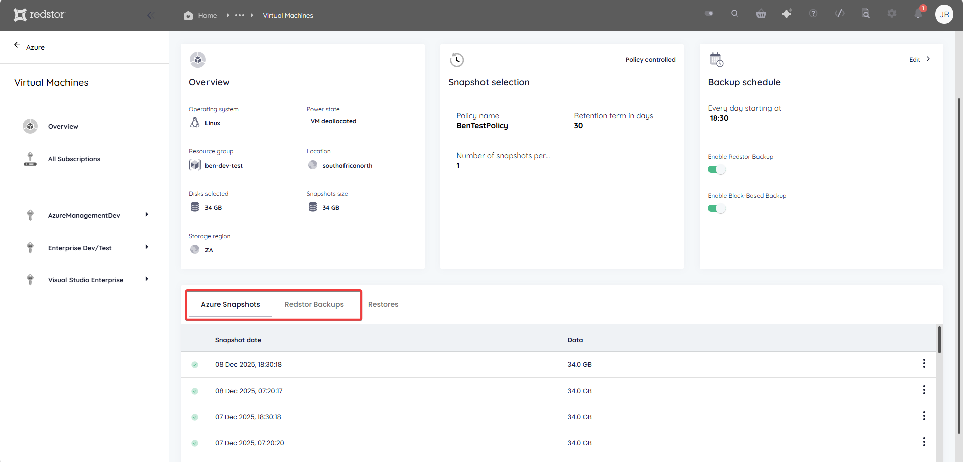 Redstor gives you the ability to backup your Azure Virtual Machines to the same resource group within Azure, and recover them back to the source or to a different group. VMs are protected by deploying a virtual backup appliance into the Azure subscription where they are located. Snapshot backups consist of disk snapshots that are kept alongside the original VM, and are subject to the same security.