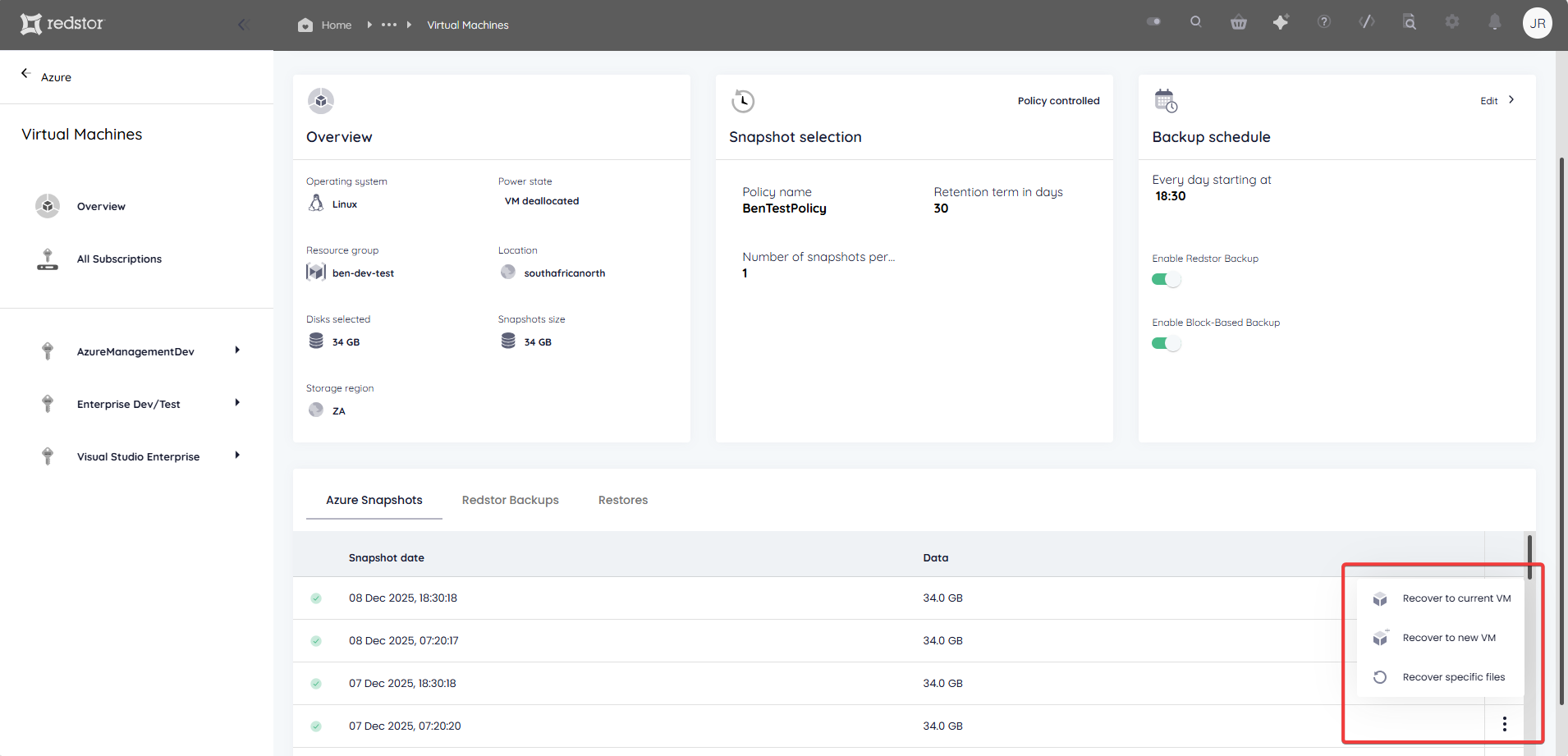- If you are using Redstor Backup for Azure VM Pro, Full System Recovery to any other target is NOT possible. That means if these snapshots are removed, your only option is file-level restore.