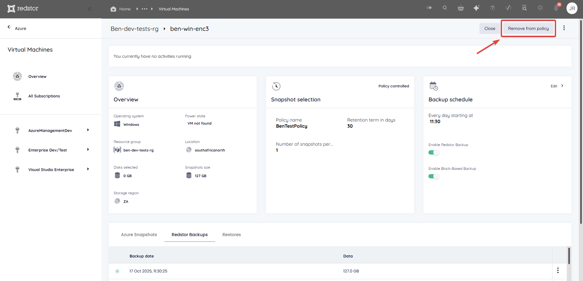 You can remove a VM from a policy at any time by going to the VM's page in the RedApp and clicking Remove from policy at the top right.