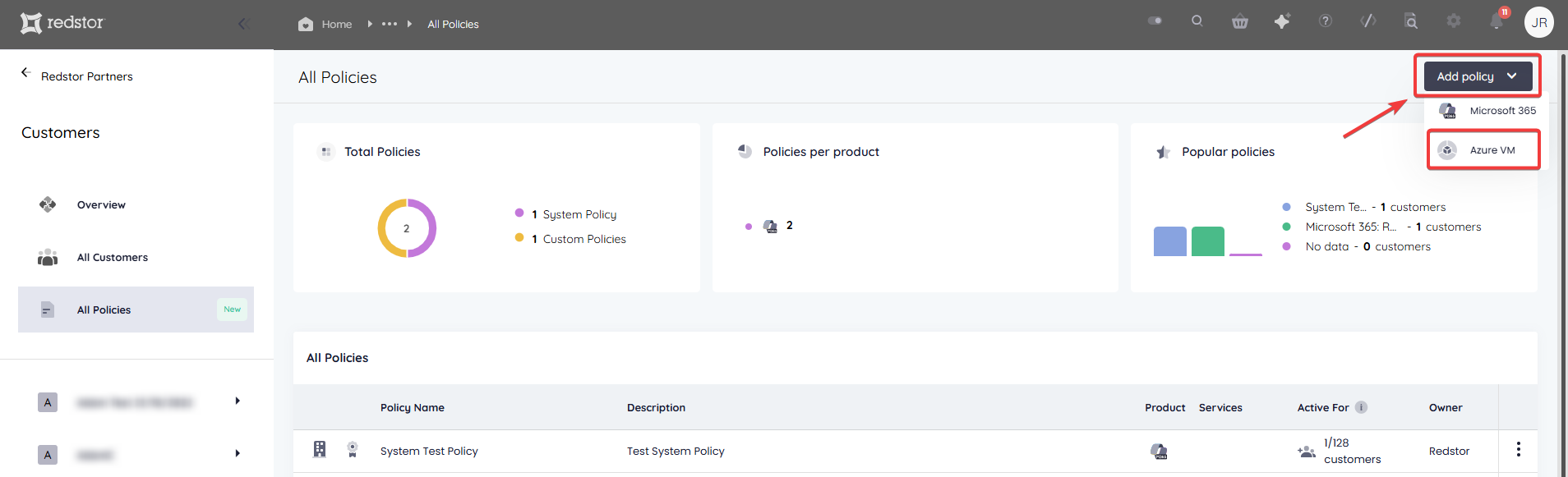 2. Click on Add policy > Azure VM at the top right.