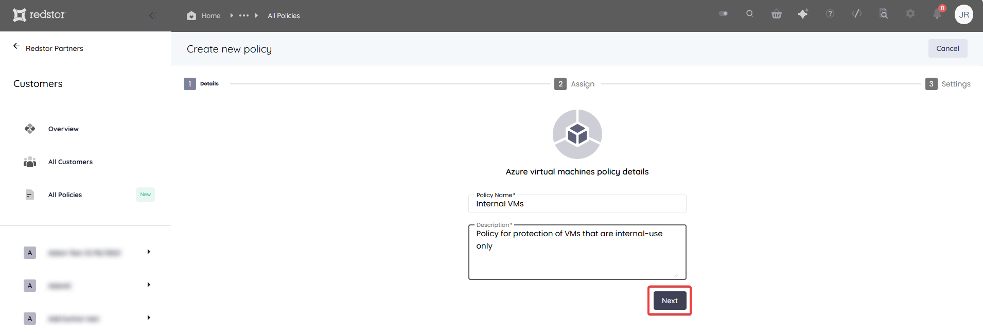 3. Enter a name and description for the policy, then click Next.