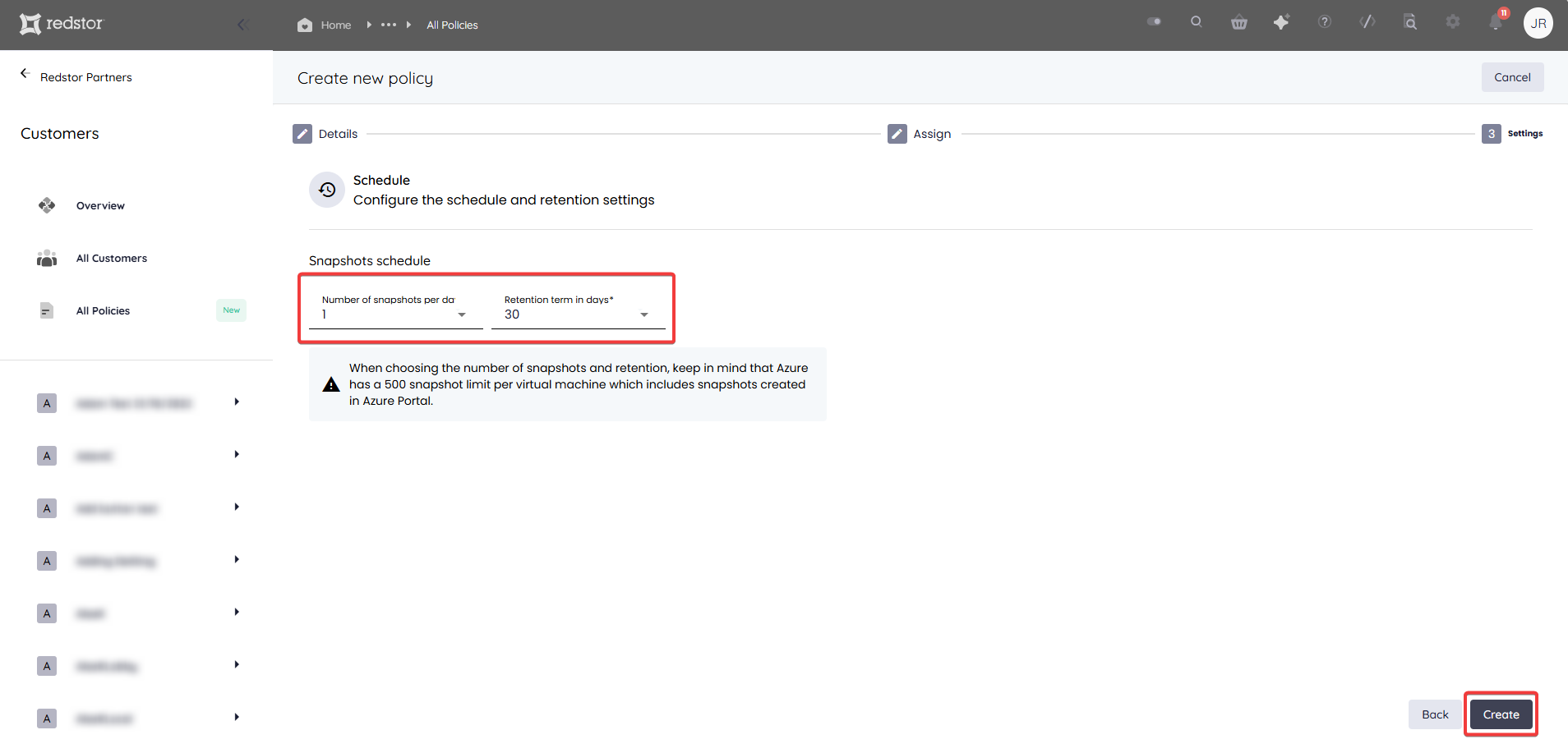 5. Set the snapshot schedule and retention for the VMs under this policy, then click Create. You will then need to authenticate with Microsoft to complete this step.