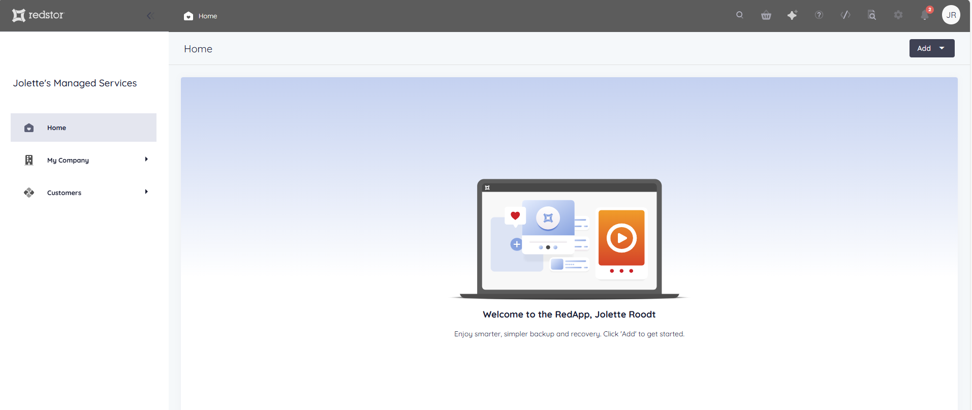 As shown here, you can access the app at any time by going to the App Launcher at the top right of the screen. (Scroll down until you see Redstor Cloud Backup.)