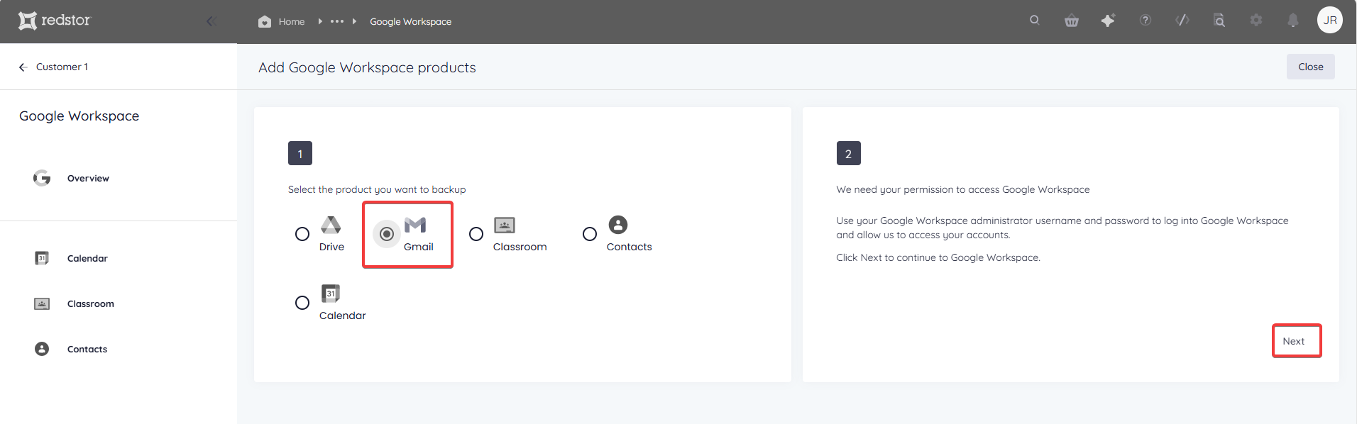 2. To add a new backup set, go to Google Workspace in the sidebar on the left. If you do not see Google Workspace listed, you will need to add it as a product.