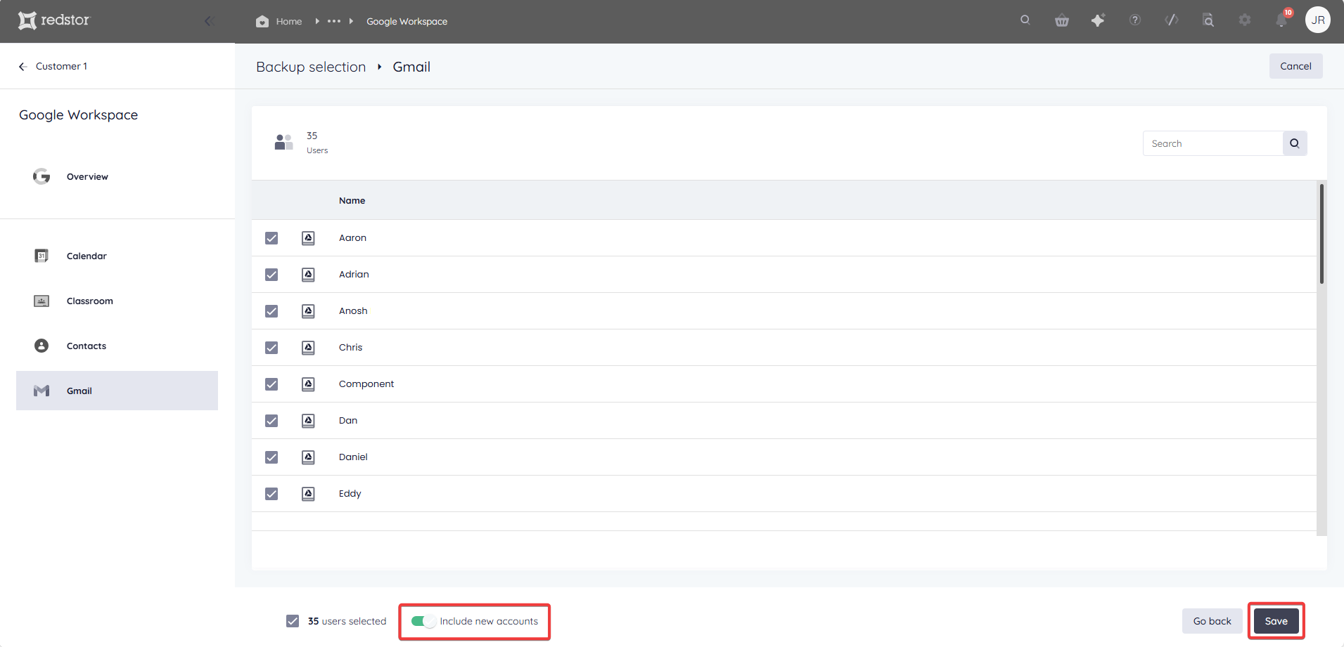 12. By default, all users will be selected for backup. To retain this selection and proceed, click Save. You can also enable Include new accounts to ensure that future additions to this tenant are automatically added to the backup selection.