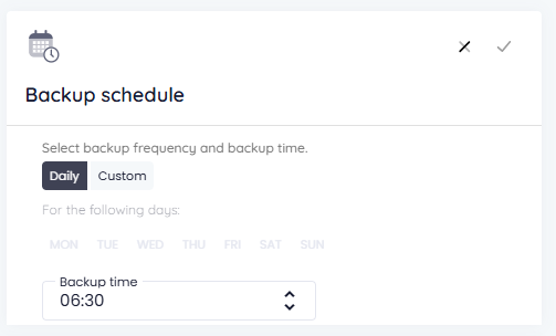 2. You can retain the default of a single daily backup (Daily), or you can set your backups to run only on specific days (Custom). In either case, use the drop-down menu to set the backup time. Set your preferences, then click on the check mark at the top right to apply them.