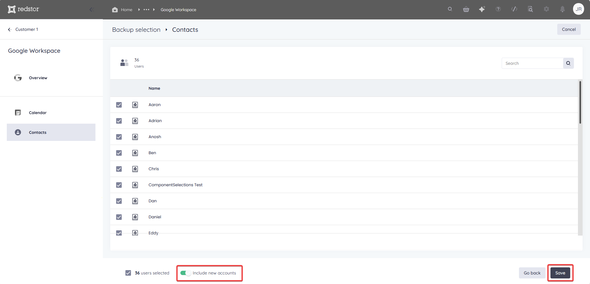 12. By default, all users will be selected for backup. To retain this selection and proceed, click Save. You can also enable Include new accounts to ensure that future additions to this tenant are automatically added to the backup selection.