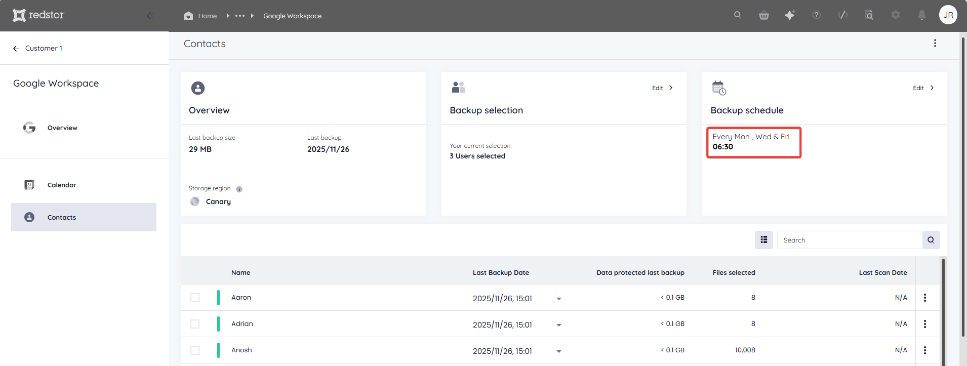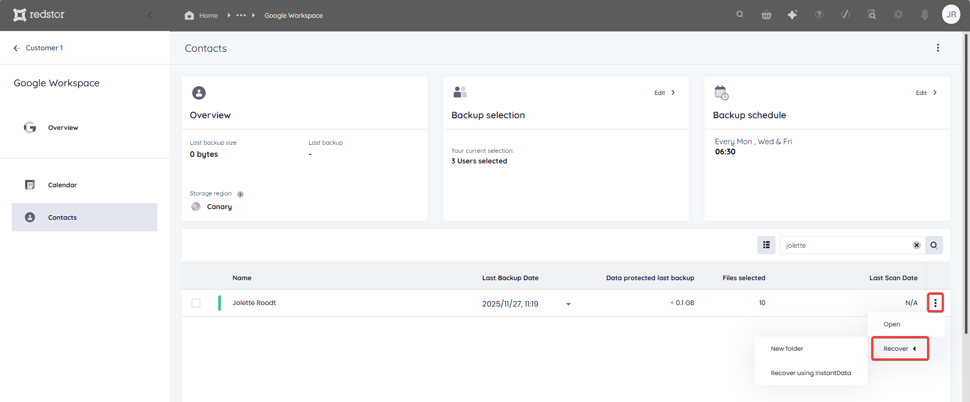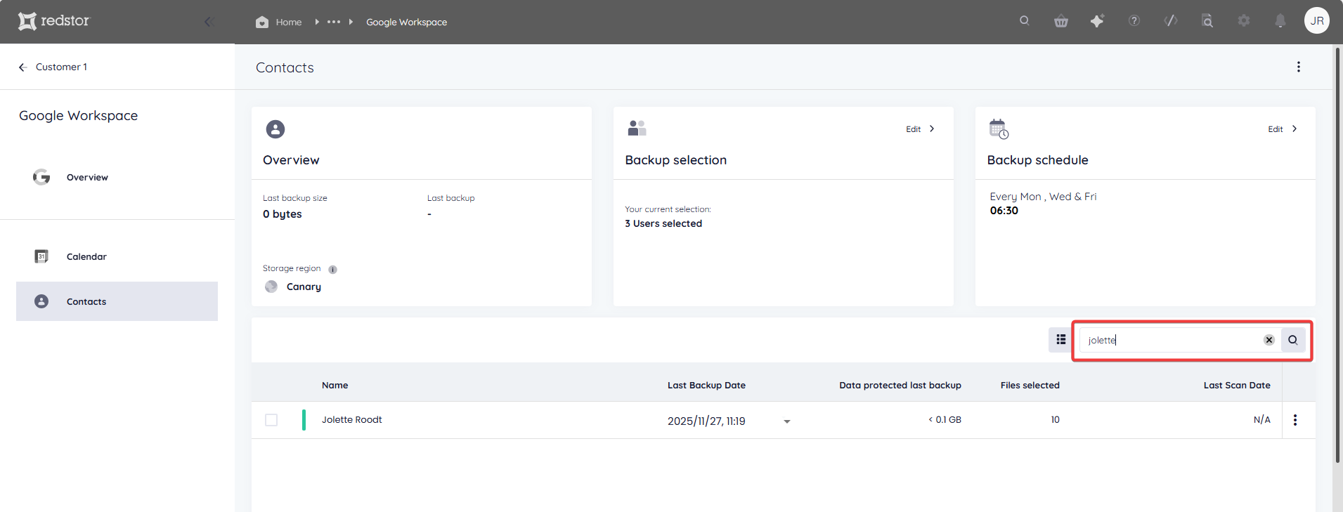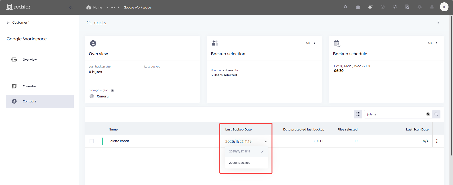 - Important: If a Google Workspace user leaves your organisation, do not delete the user. Redstor has no way of restoring a deleted user's Contacts or Calendar. Gmail can be restored to a different account. If you withdraw the departing user's Google Workspace licence, even if you do not delete the user, Google is under no obligation to retain that user's data. The data may appear to remain present but can be removed by Google at any time as part of cleanup. Consider assigning an archive licence or exporting the data for alternative storage instead.
