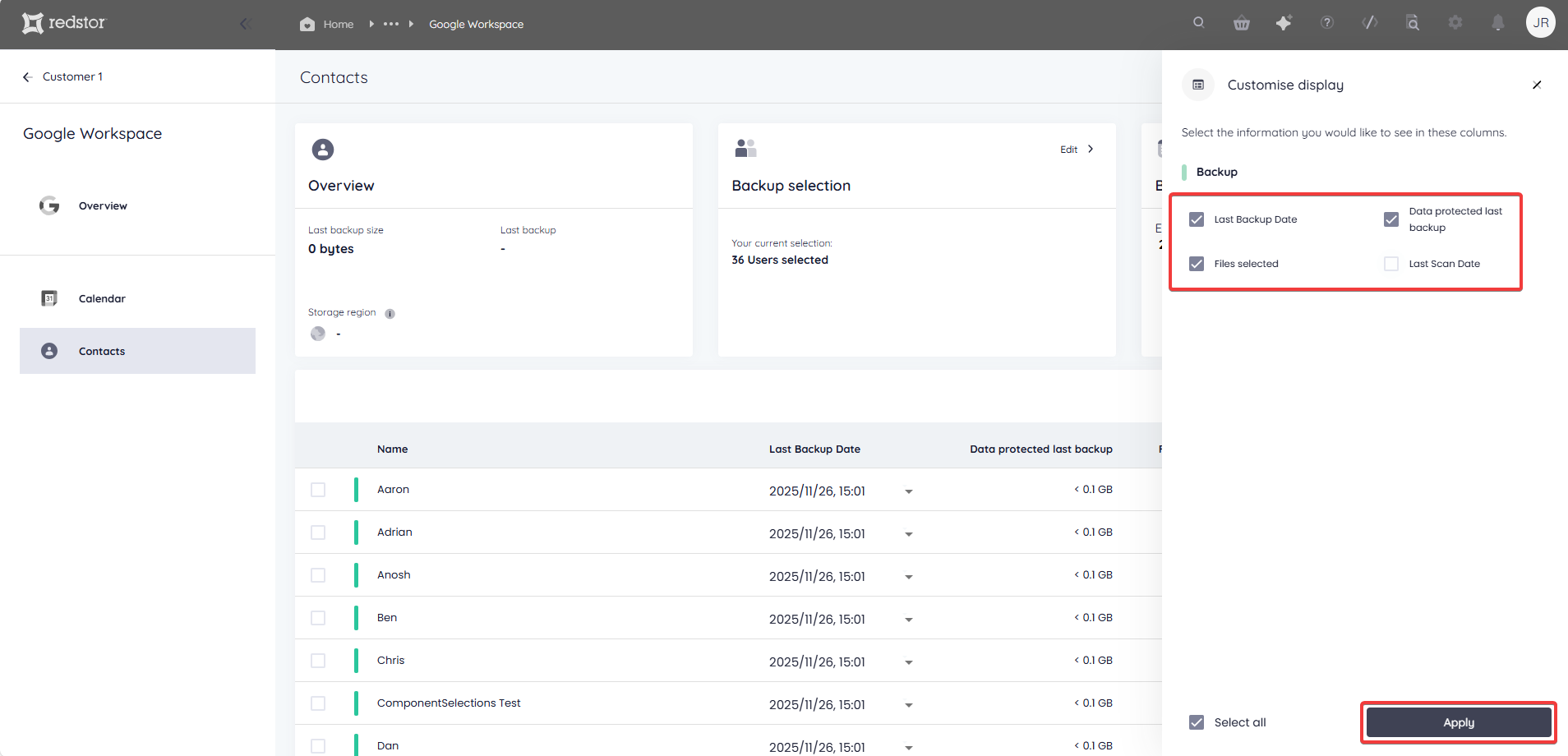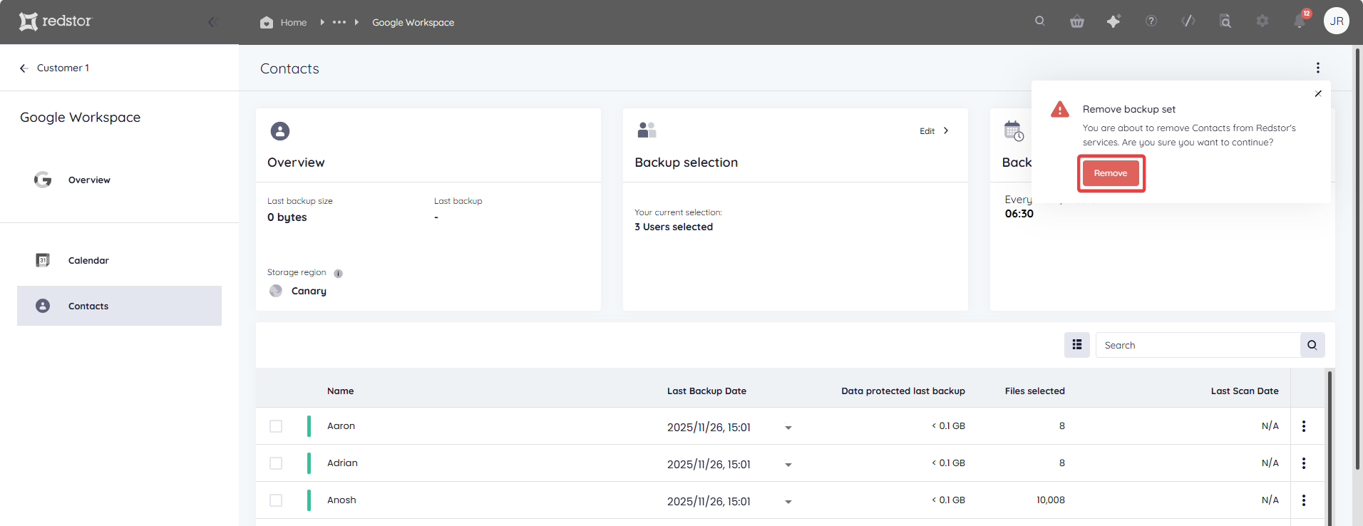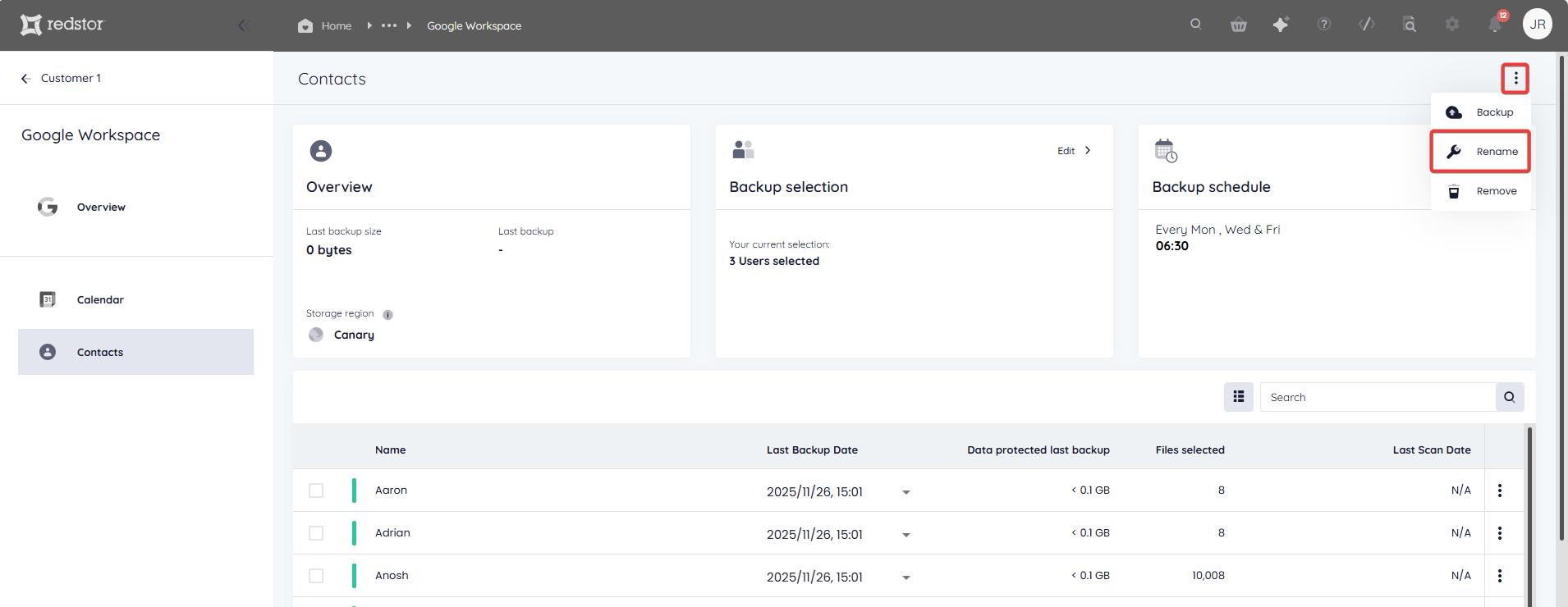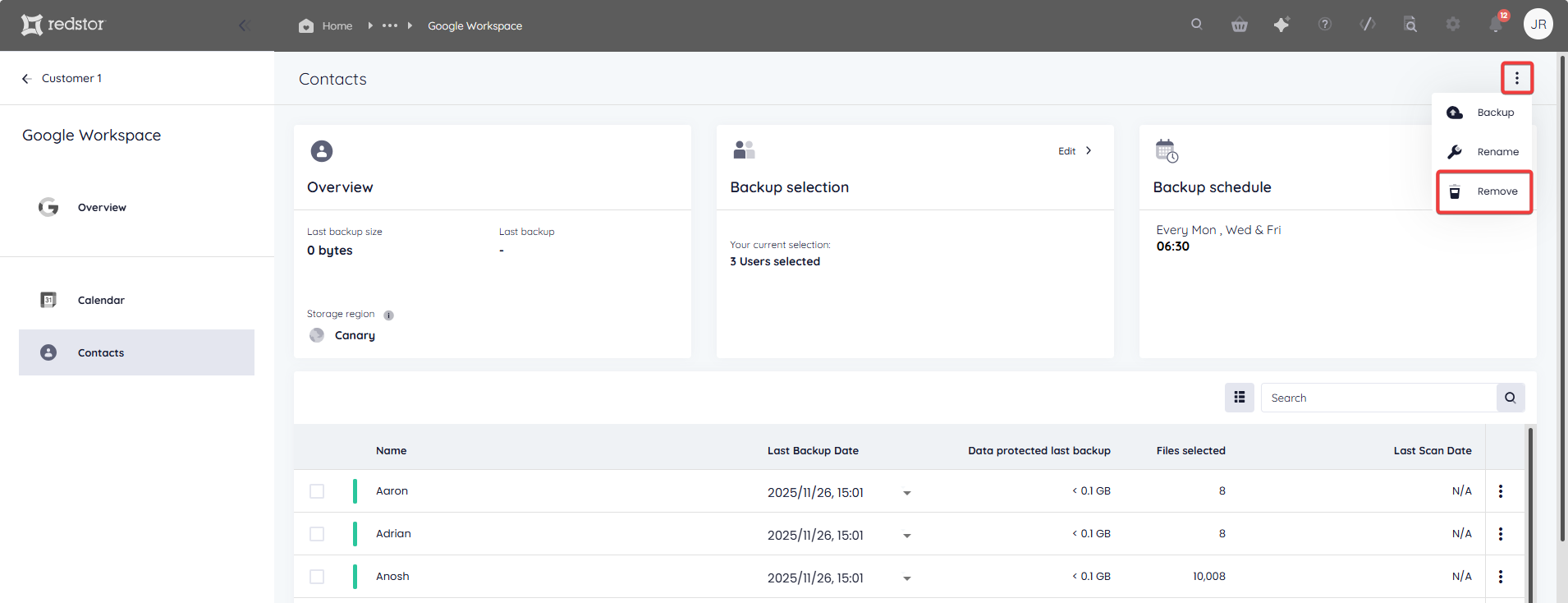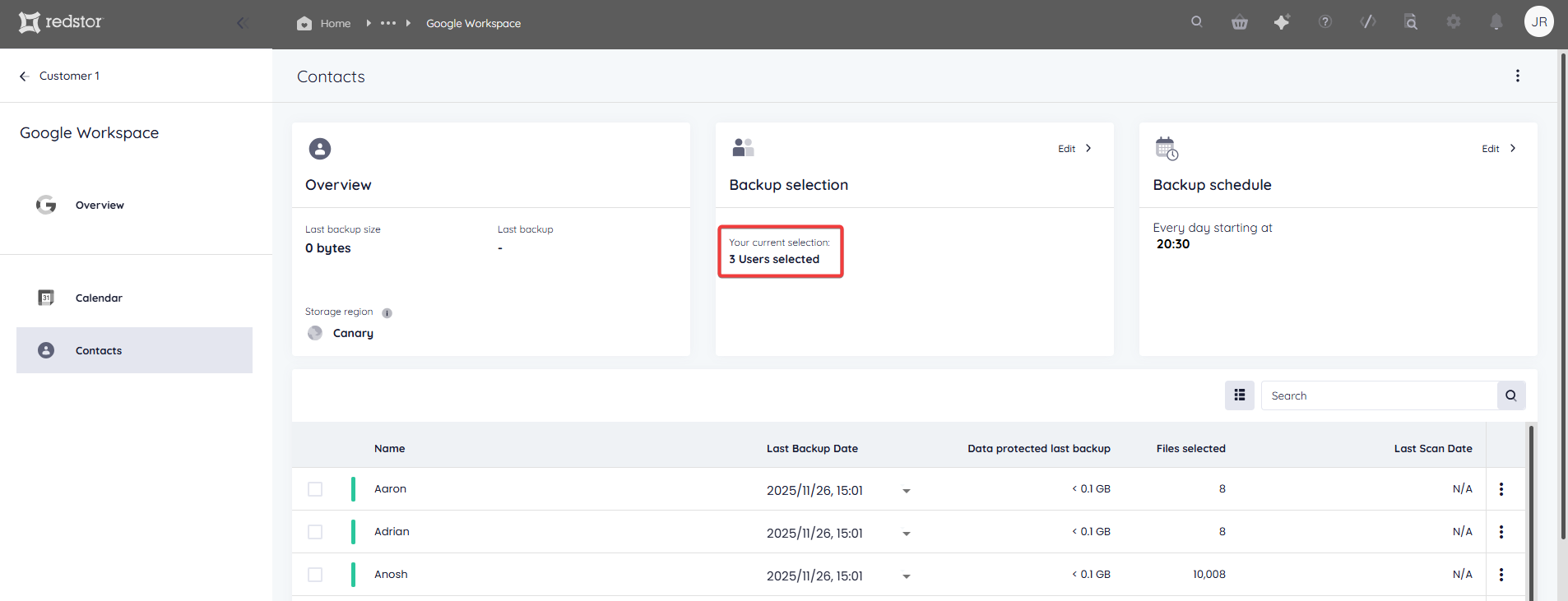 - Important: If a Google Workspace user leaves your organisation, do not delete the user. Redstor has no way of restoring a deleted user's Contacts or Calendar. Gmail can be restored to a different account. If you withdraw the departing user's Google Workspace licence, even if you do not delete the user, Google is under no obligation to retain that user's data. The data may appear to remain present but can be removed by Google at any time as part of cleanup. Consider assigning an archive licence or exporting the data for alternative storage instead.