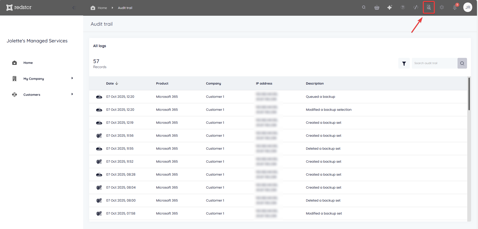 As shown here, you can access the app at any time by going to the App Launcher at the top right of the screen. (Scroll down until you see Redstor Cloud Backup.)