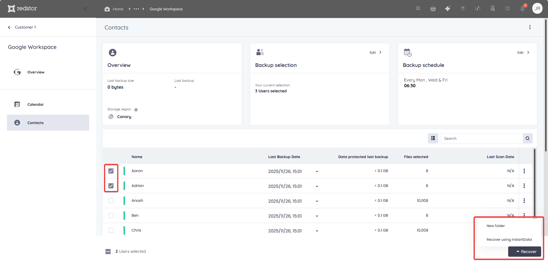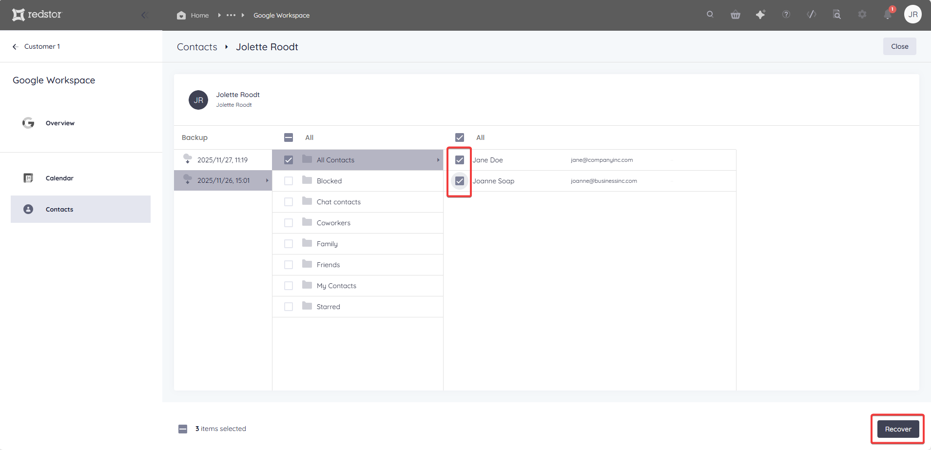 - New folder recovers the contacts to the label Redstor Restore on the user's Google Contacts page. The recovery timestamp will also be shown.