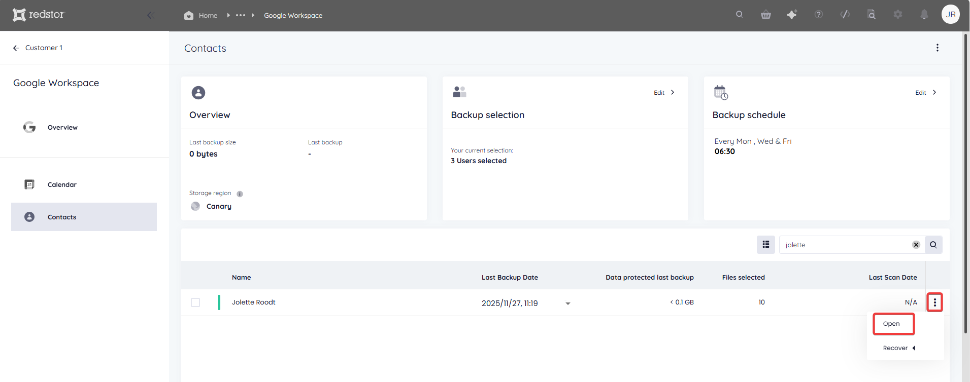 If you only want to recover one or more individual items from a user's contacts, click on the user name to expand its contents. Alternatively, click on the menu icon on the right and go to Open.