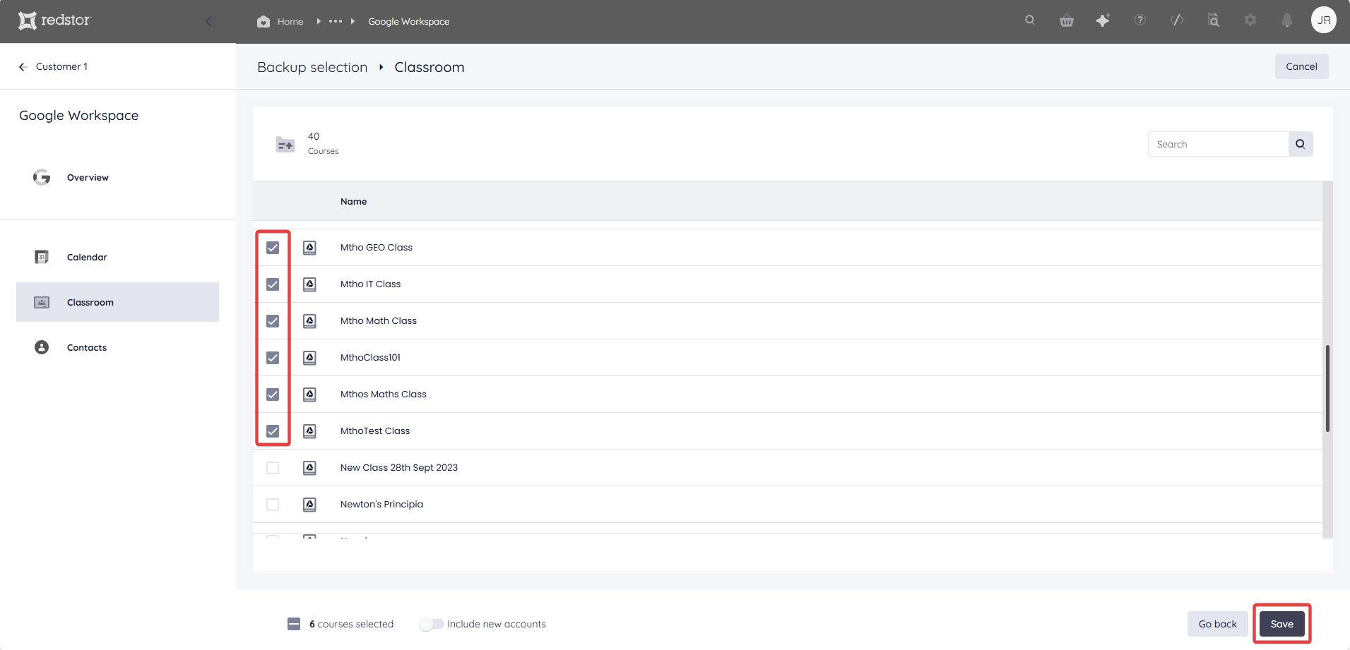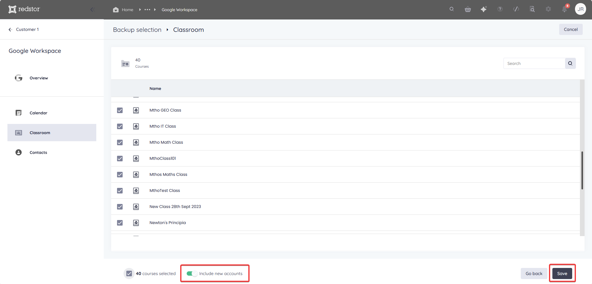 12. By default, all courses will be selected for backup. To retain this selection and proceed, click Save. You can also enable Include new accounts to ensure that future additions to this tenant are automatically added to the backup selection.