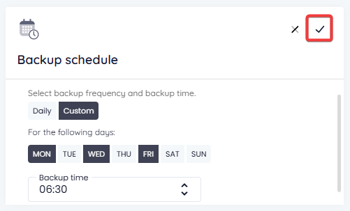 2. You can retain the default of a single daily backup (Daily), or you can set your backups to run only on specific days (Custom). In either case, use the drop-down menu to set the backup time. Set your preferences, then click on the check mark at the top right to apply them.