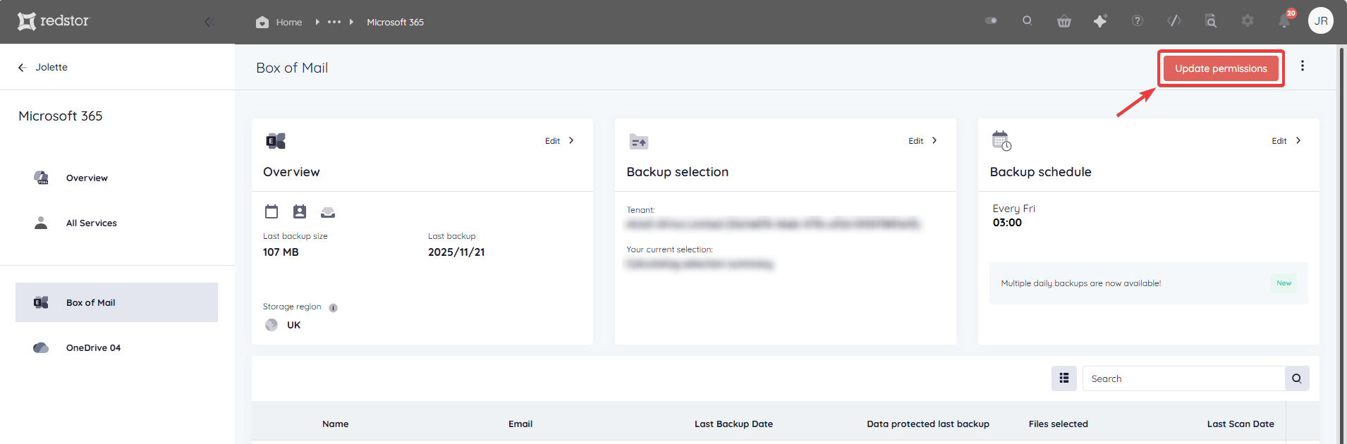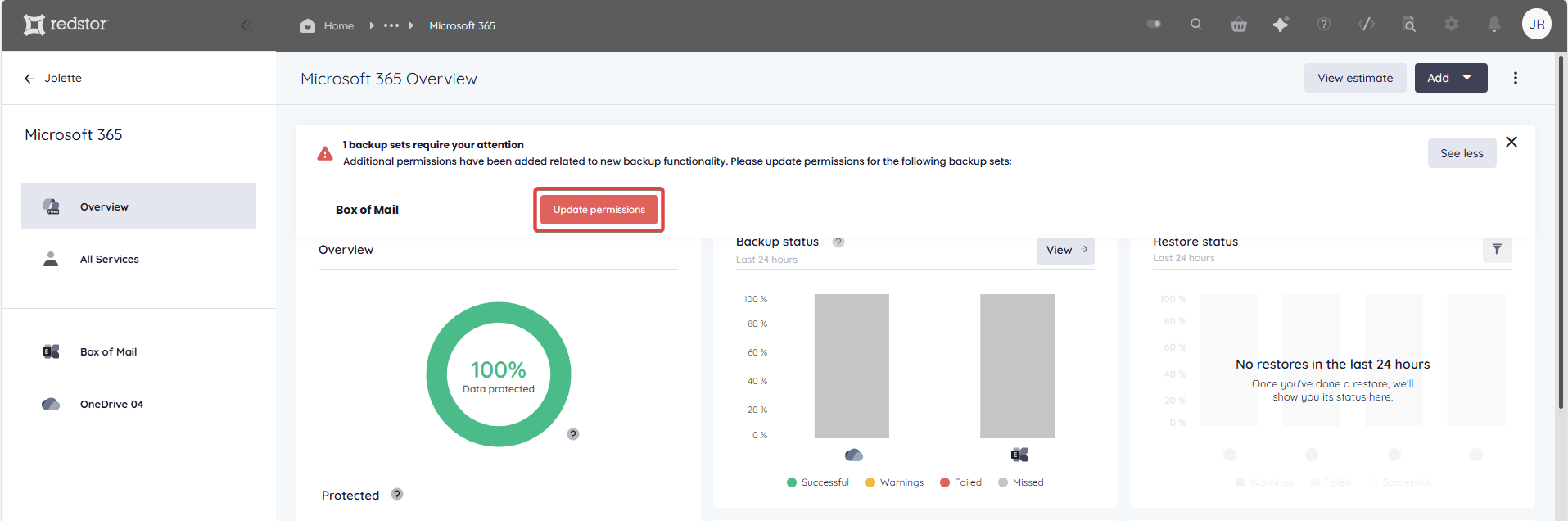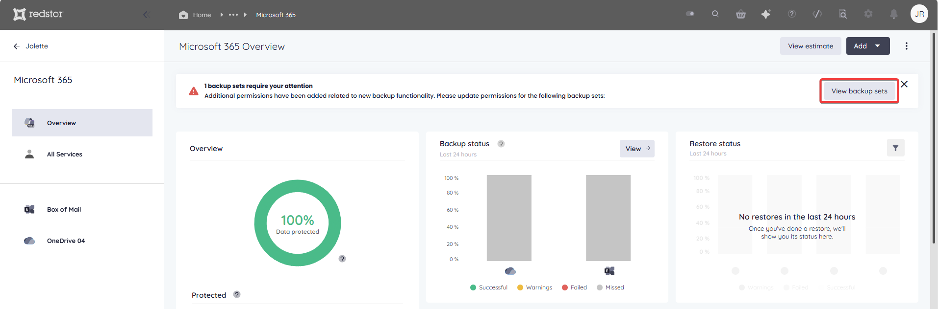 1. On the banner on the Microsoft 365 Overview page, click on View backup sets and then Update permissions.