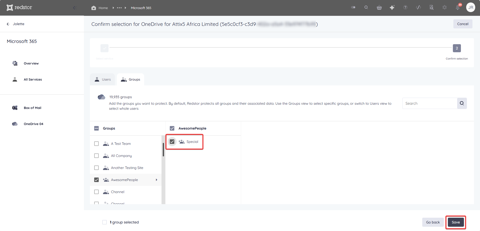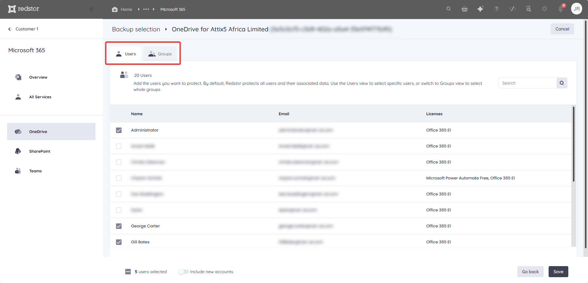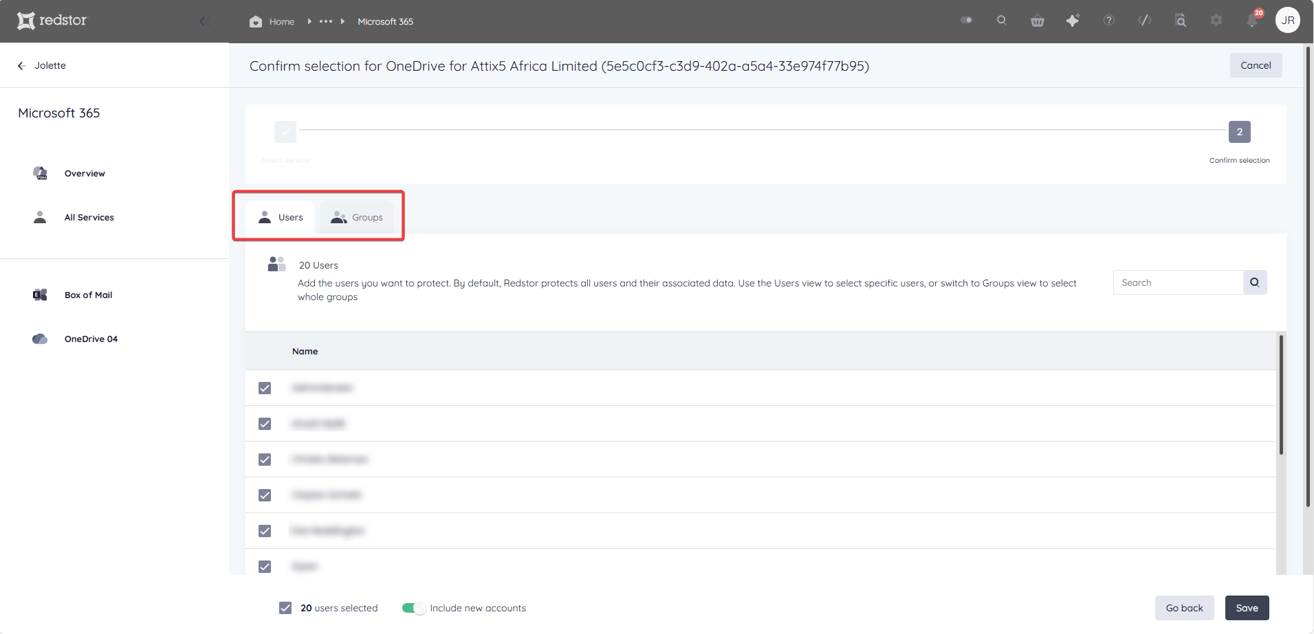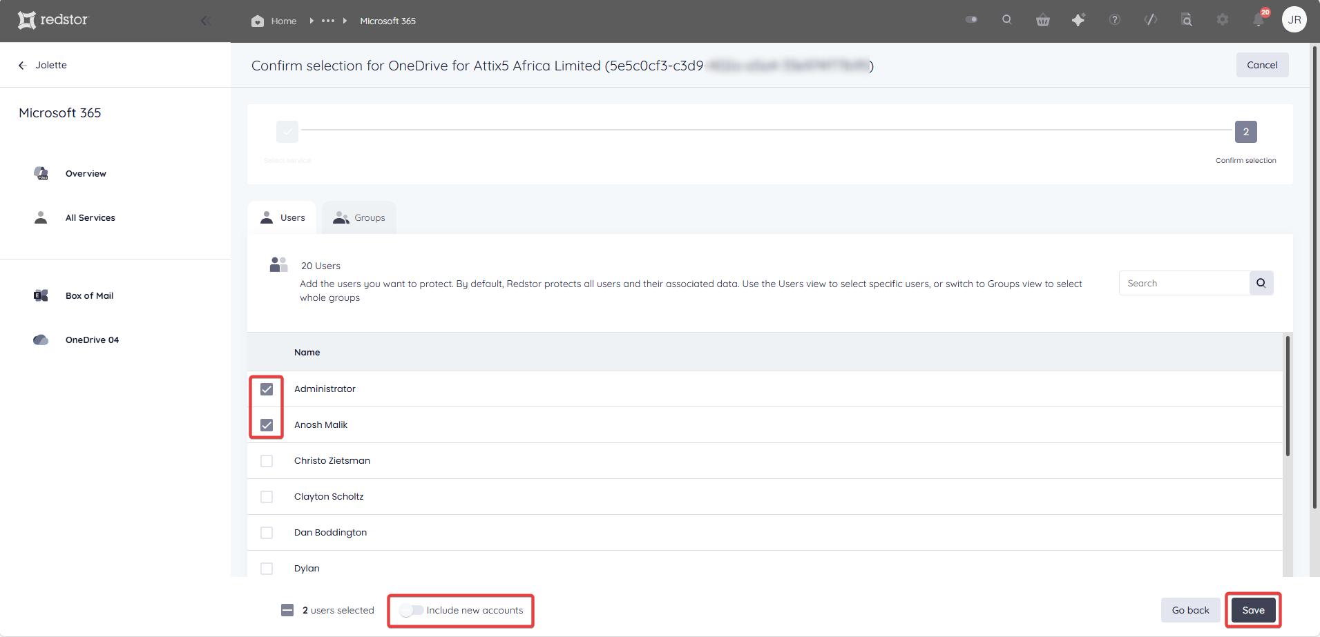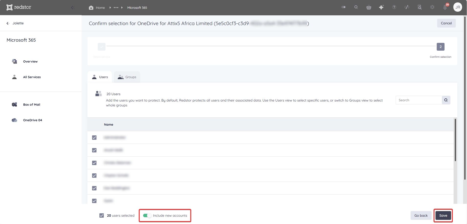 By default, all users/groups will be selected for backup. To retain this selection and proceed, click Save. In the Users tab, you can also enable Include new accounts to ensure that future additions to this tenant are automatically added to the backup selection.
