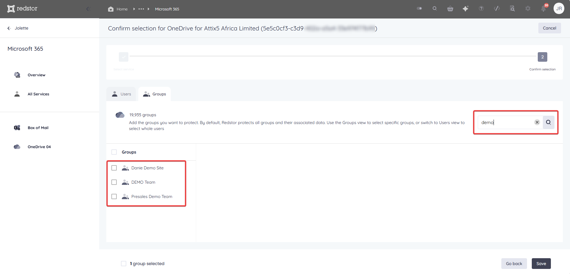 - The Microsoft tenant ID for the specific tenant is shown at the top of the backup selection page for reference.