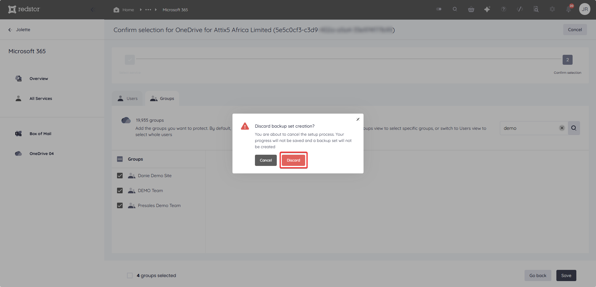 - Data from users that were present in the original selection and are present in the new selection will be retained and backups will continue uninterrupted.