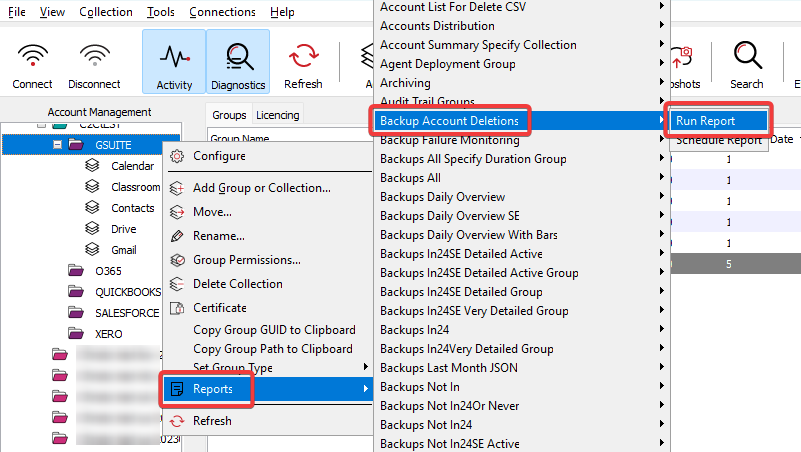 To check which accounts have been deleted, right-click the name of the Group or Collection where the accounts were located and go to Reports > Backup Account Deletions > Run Report.