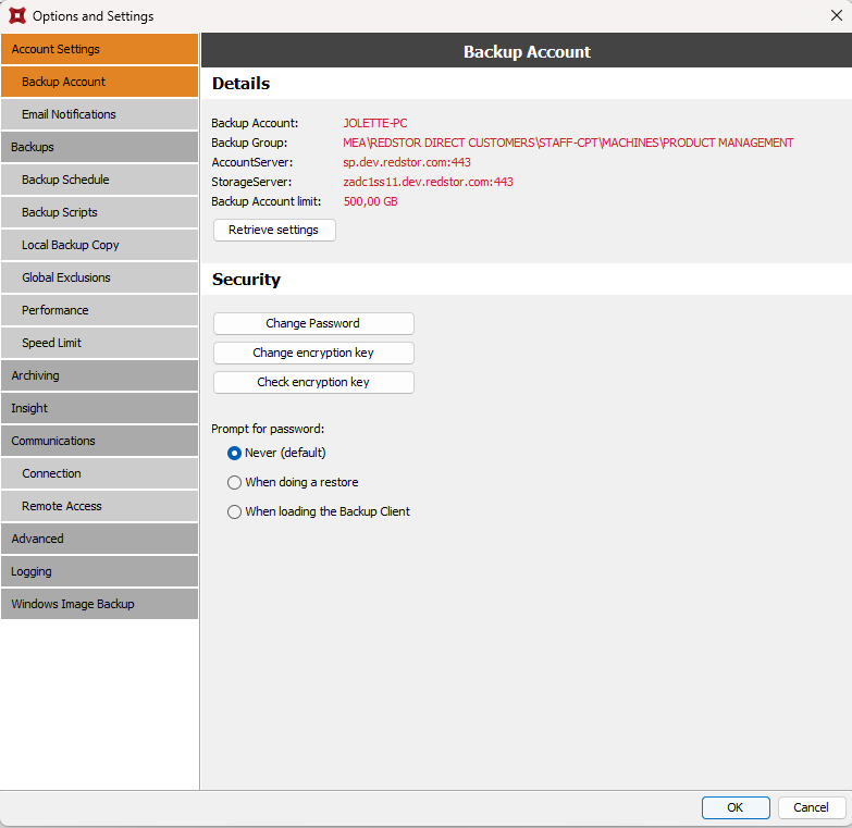 The security options (password and encryption key) of the ESE agent can be configured in Options > Account Settings > Backup Account > Security.