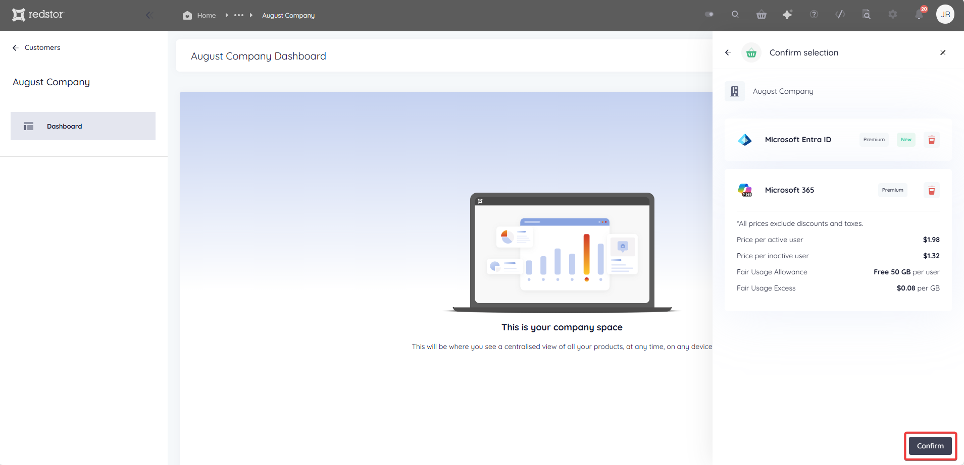 6. Review the product pricing and click Confirm. (The prices shown in the screenshot below are for illustration only.)