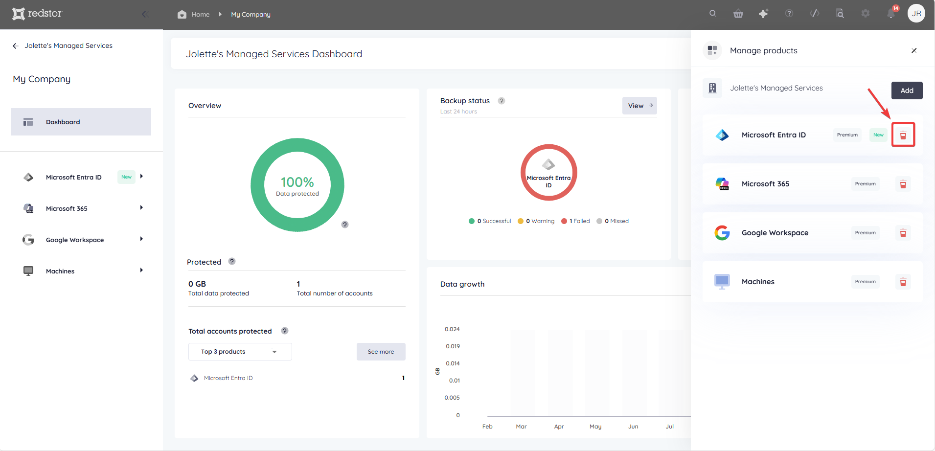 3. In the product list that appears, locate the product you want to remove and click on the bin icon to its right.