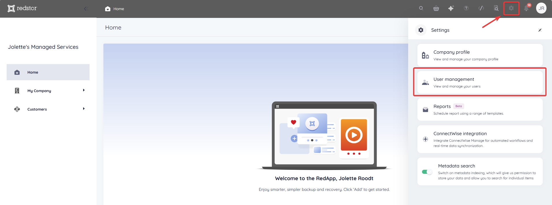 1. In the RedApp, click on Settings (cog icon) at the top right and go to User management.