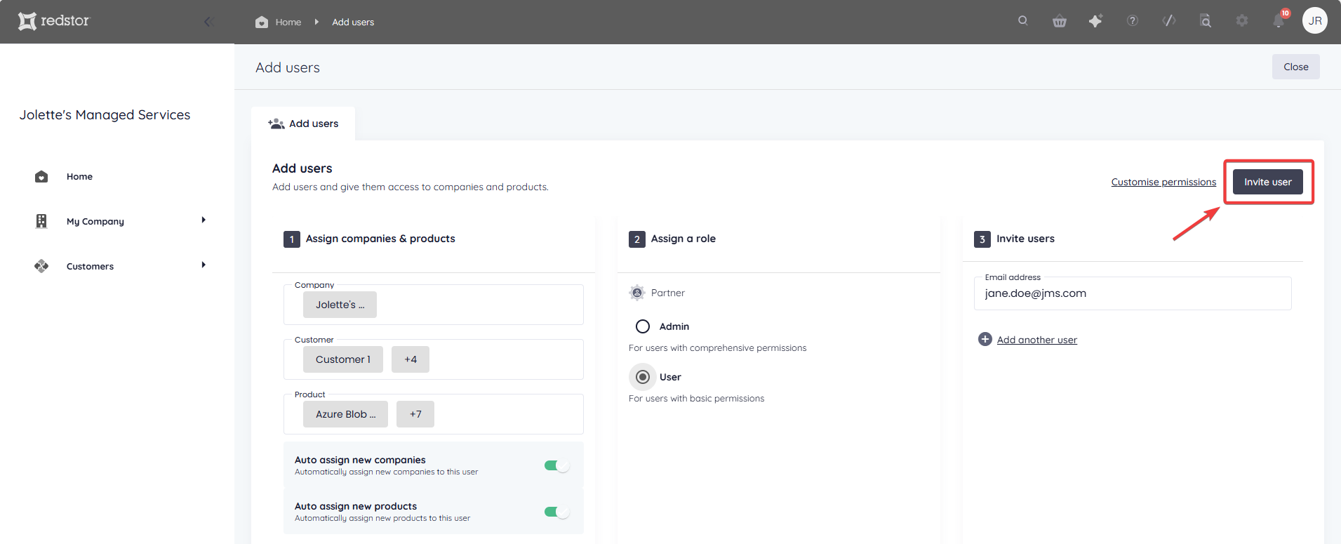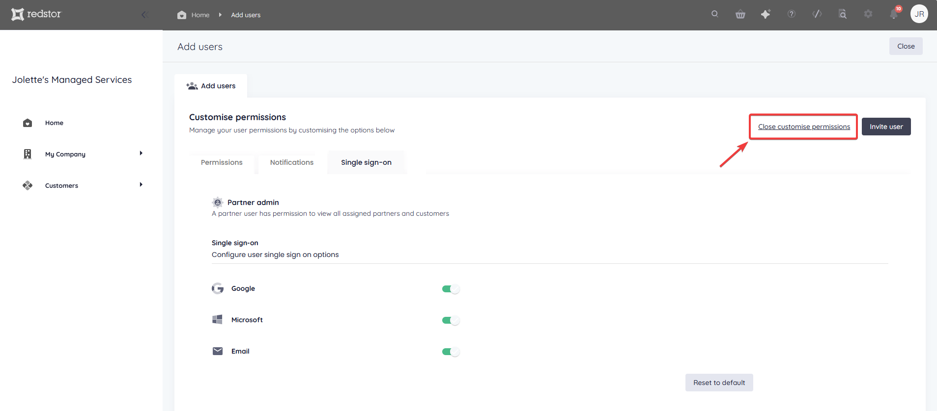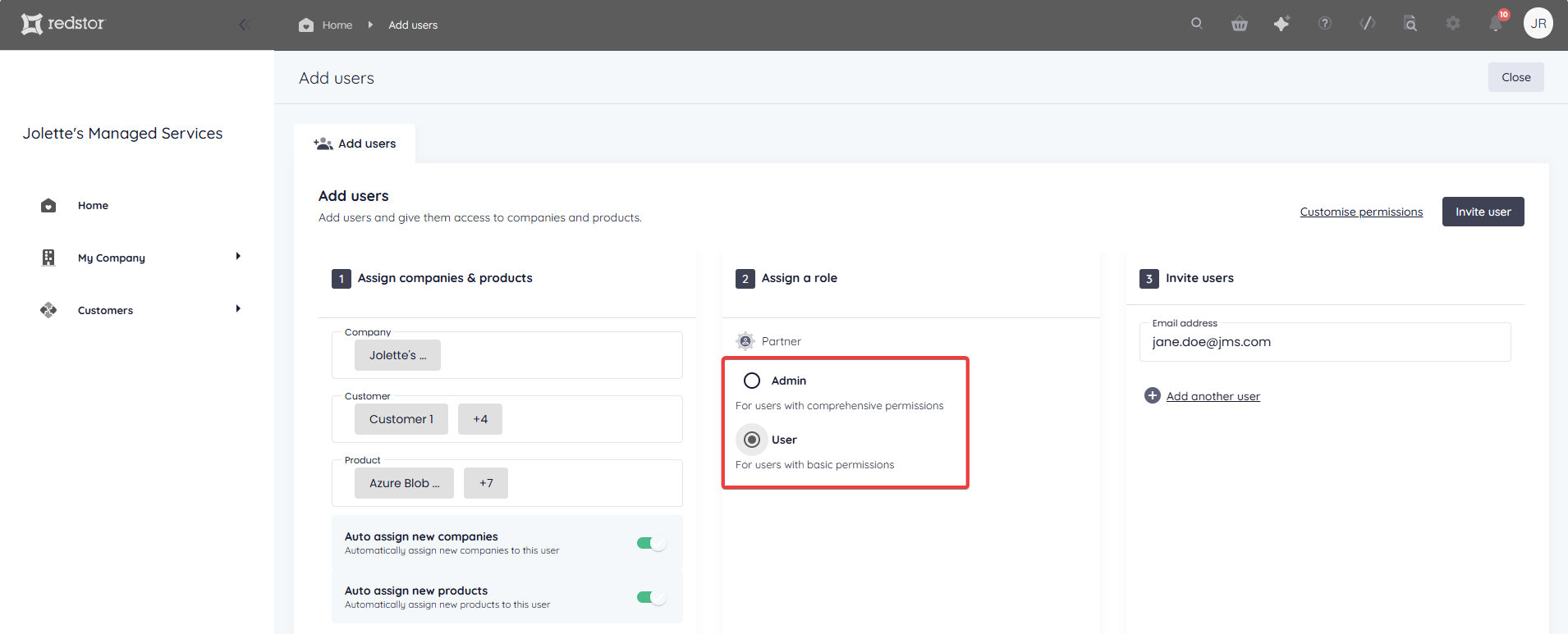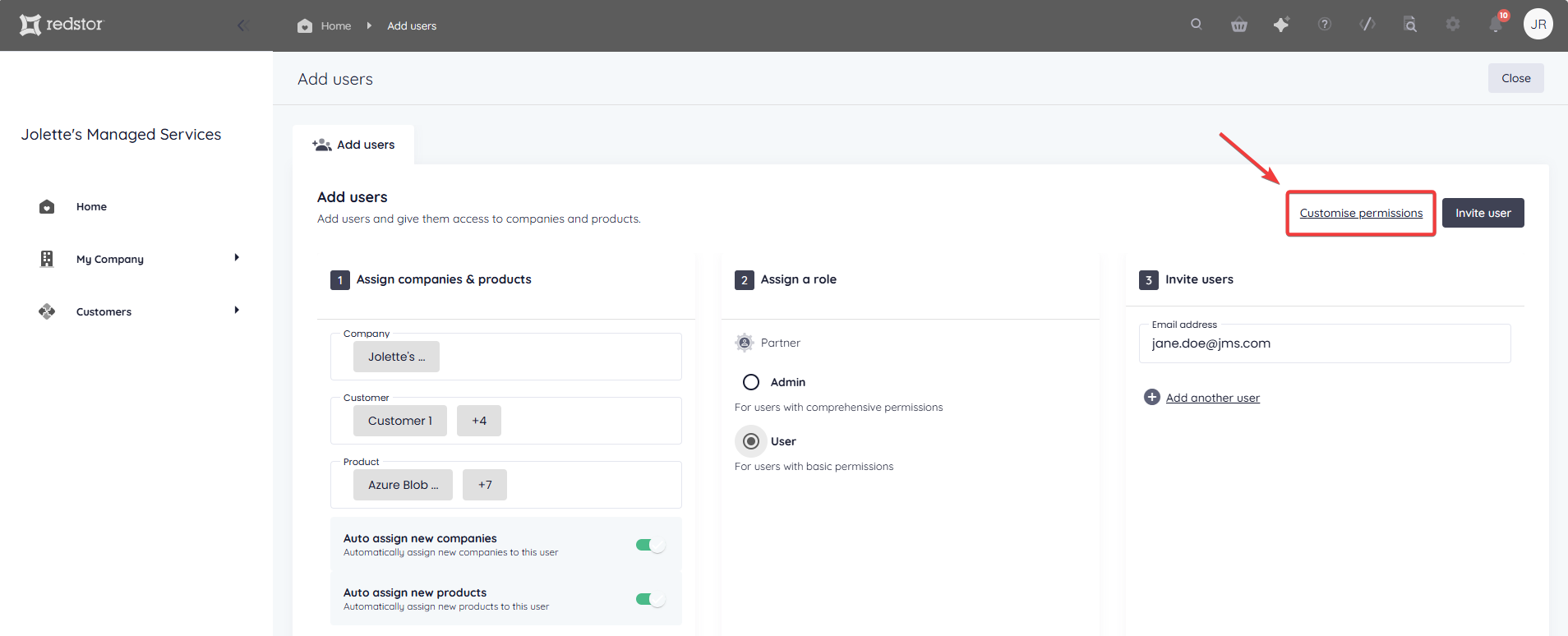 To set more granular permissions for the user you are adding, click Customise permissions.