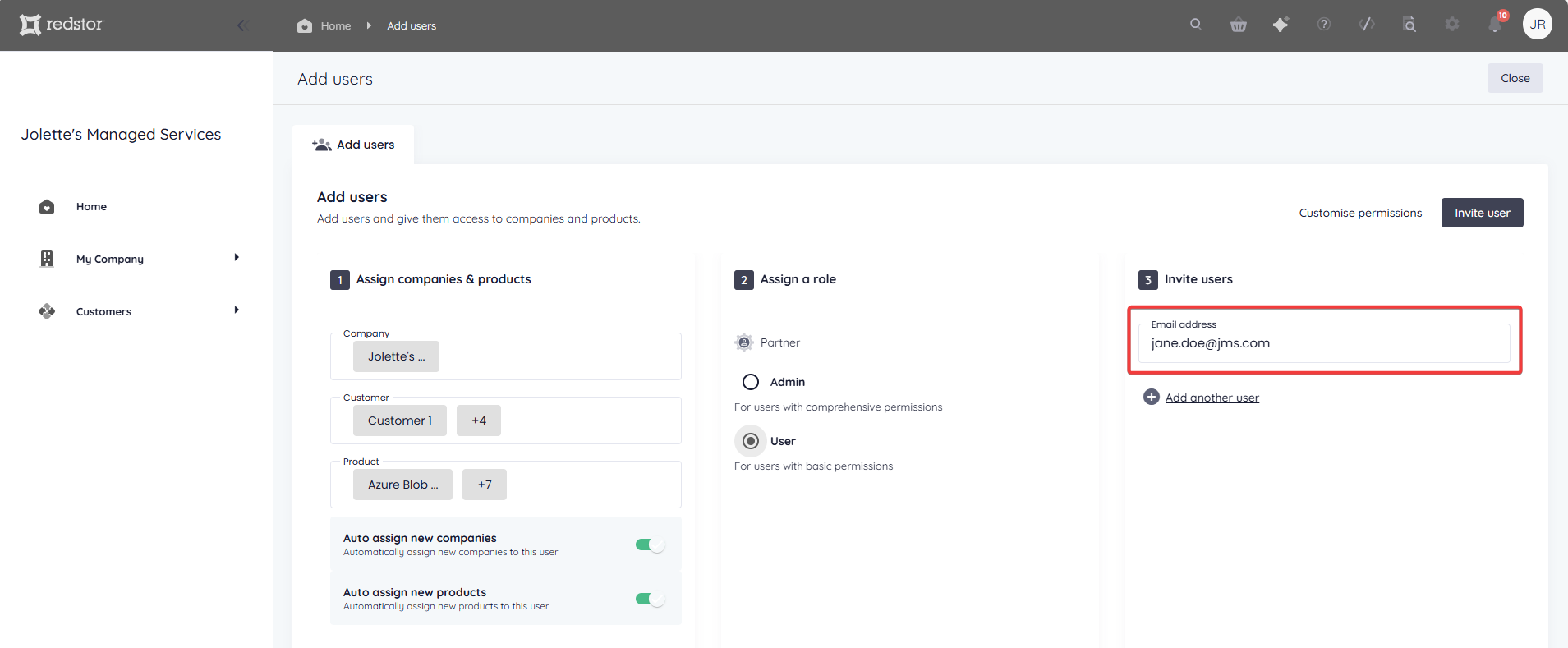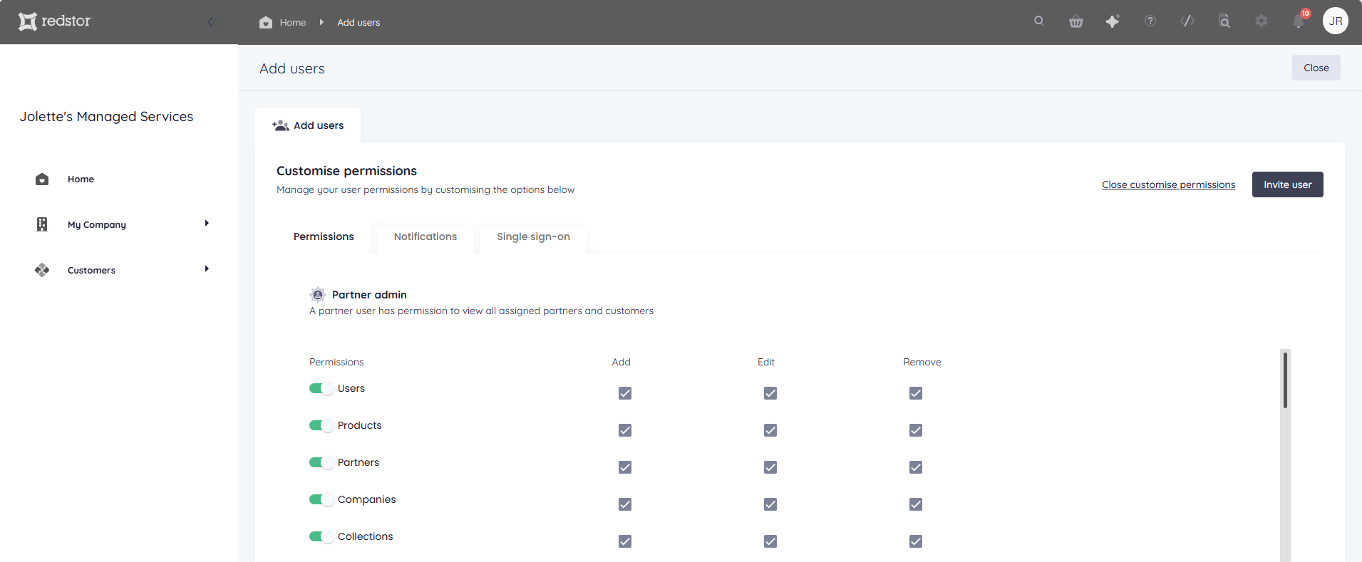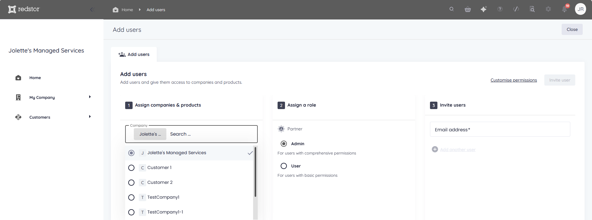 To set more granular permissions for the user you are adding, click Customise permissions.
