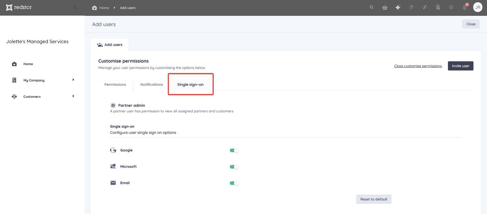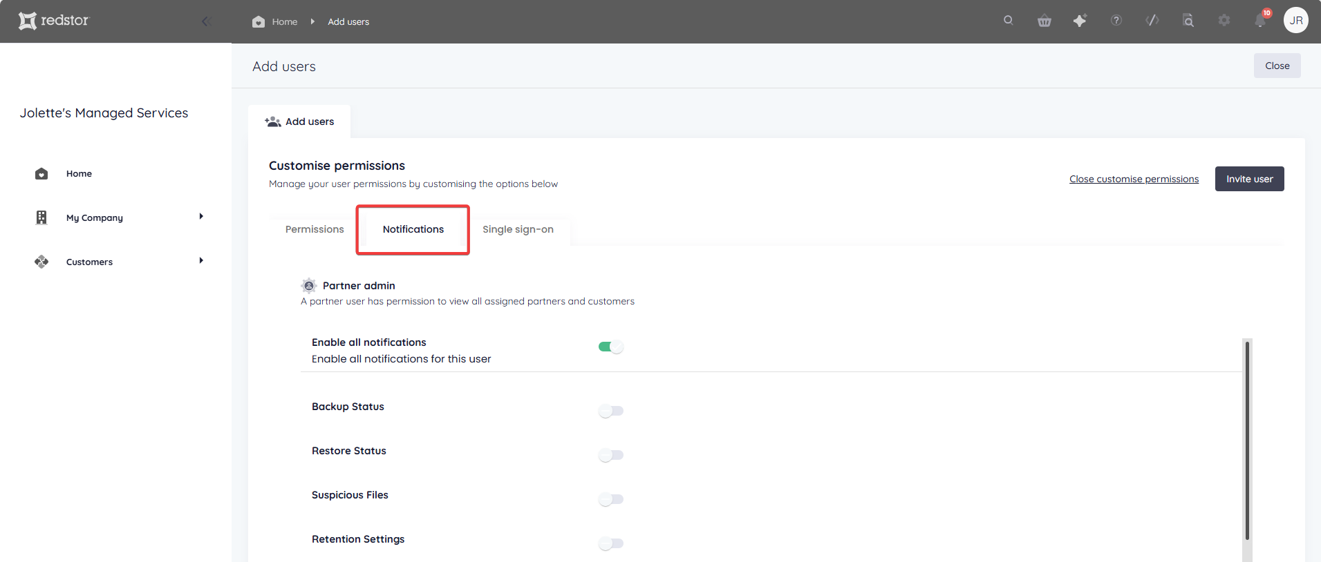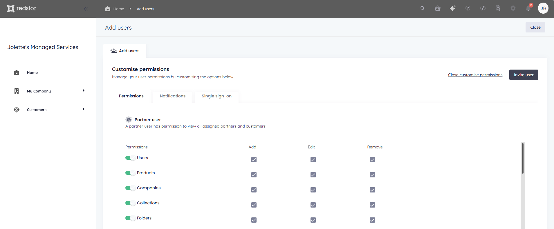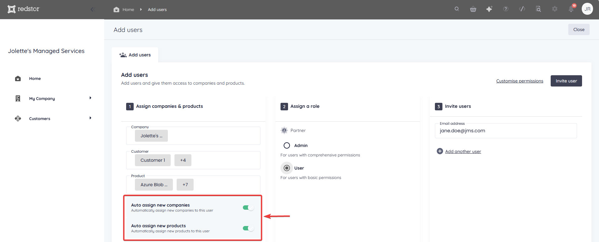 To set more granular permissions for the user you are adding, click Customise permissions.