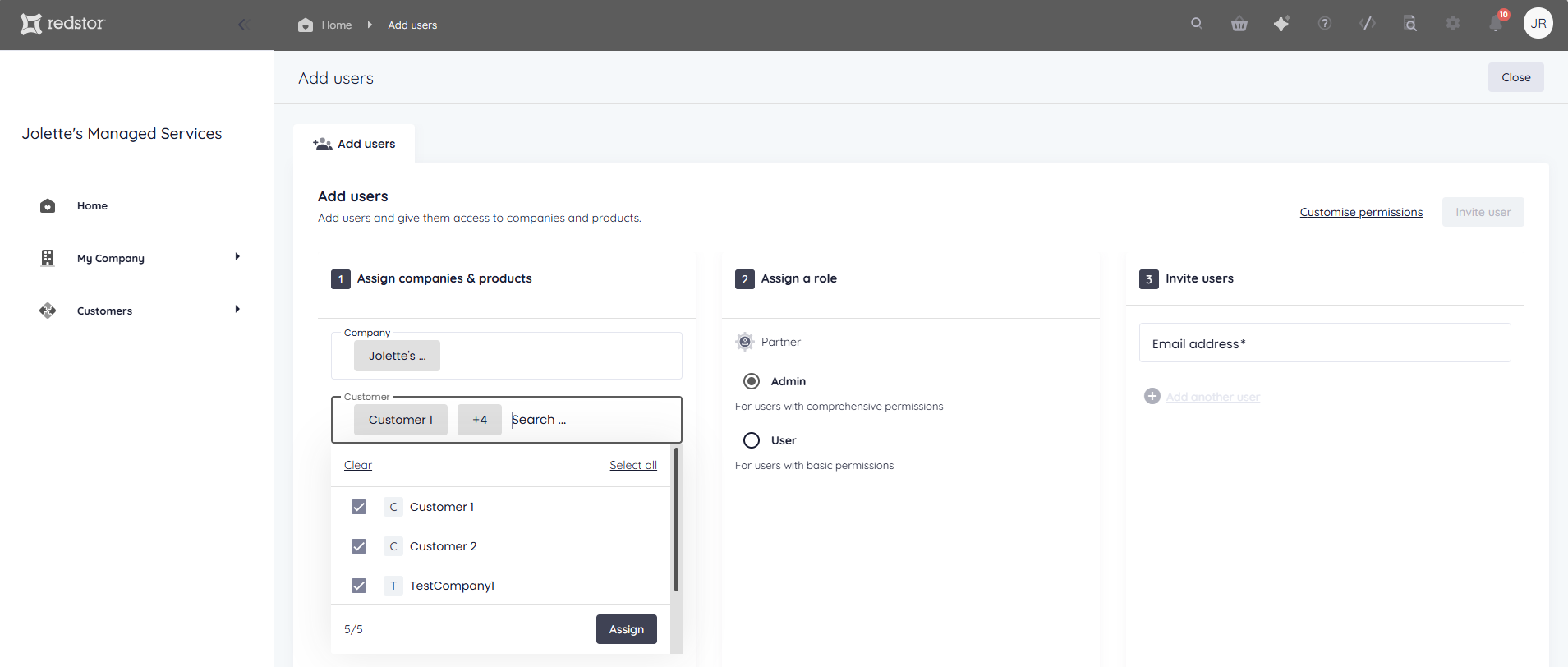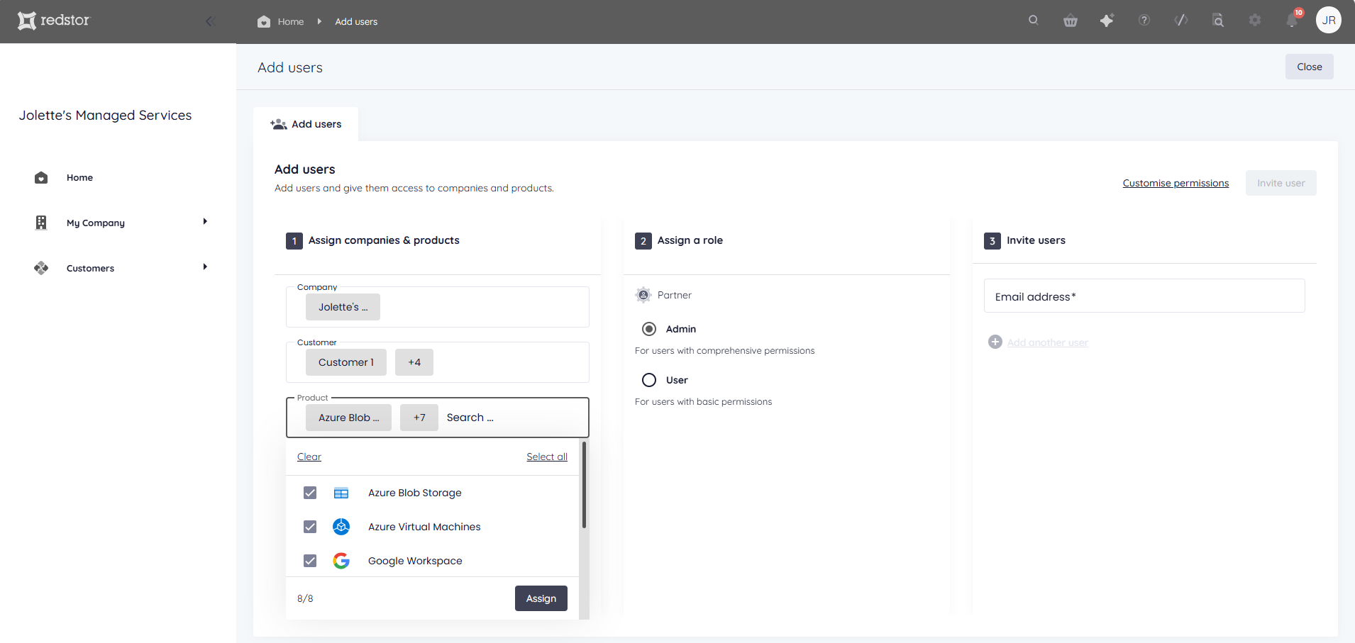 - In the Customer field, select the customers you want this user to administrate. You can select multiple customers. When you're ready, click Assign.
