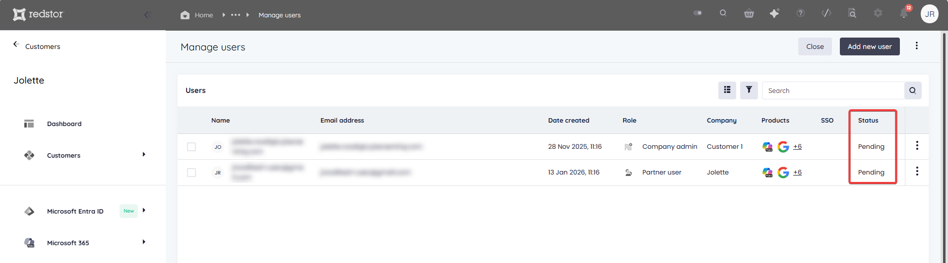 The new user/s will now be listed on the Manage users page with the status Pending.