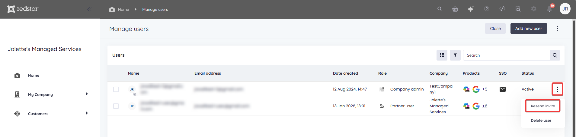- If a user does not receive their email invite within a reasonable amount of time, you can resend it. On the Manage users page, expand the menu next to the user's name and click Resend invite.